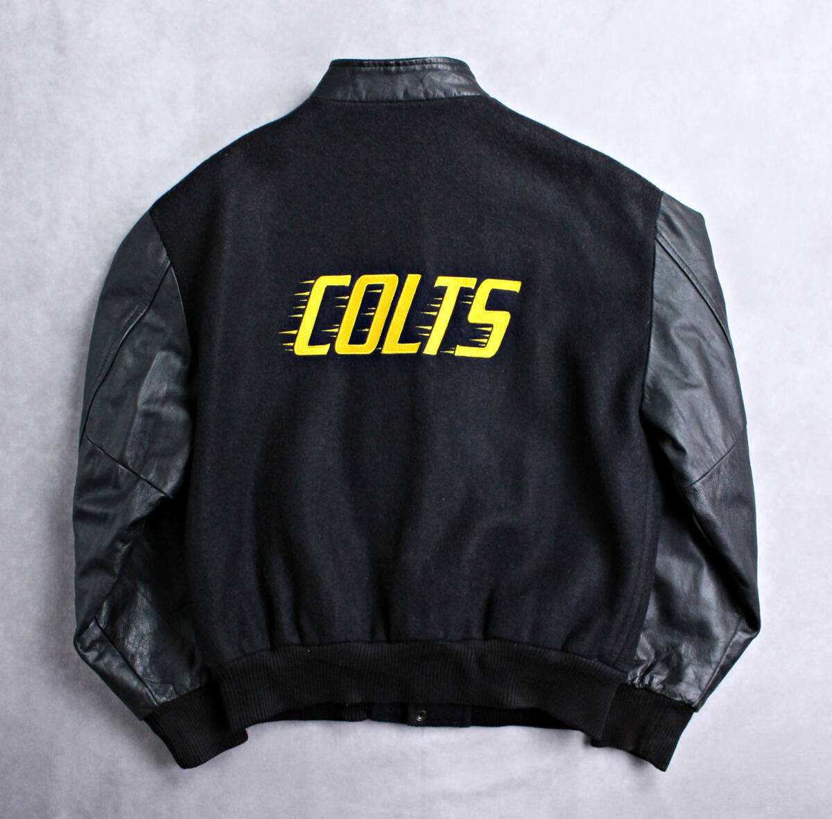 > 【CANADA SPORTSWEAR】COLTS金色刺しゅう 防寒中綿入り 袖革スタジャン ブラックxブラック Lサイズ相当 ビンテージ