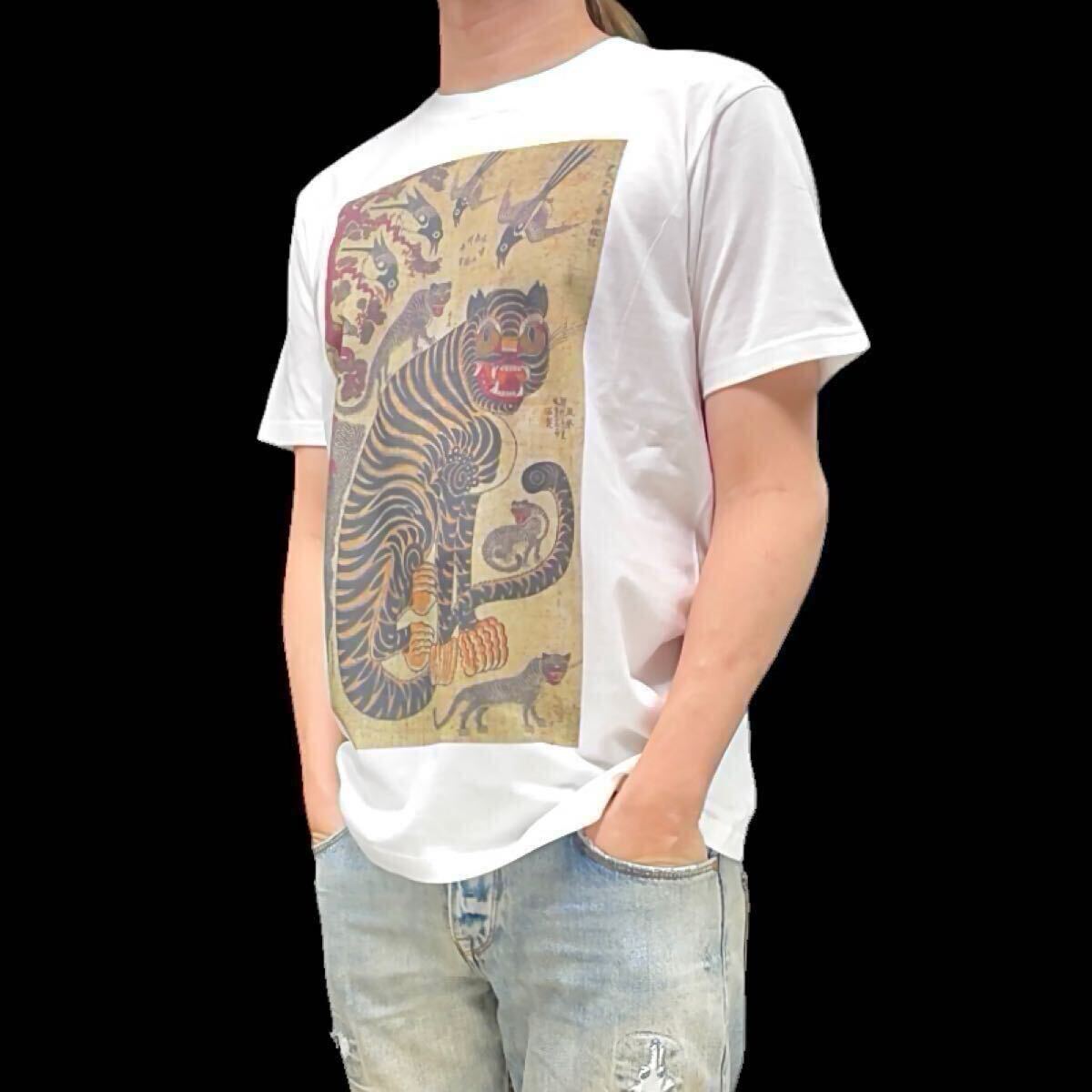 - 新品 ビッグプリント 朝鮮民画 19世紀ヴィンテージ レトロ 韓国 魔よけ絵 アジア アート 虎図 トラ タイガー Tシャツ ユニセックス Sサイズ