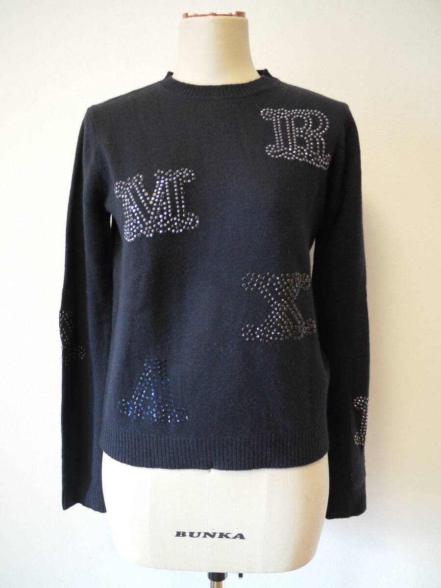 > Max Mara マックスマーラ ラインストーンロゴ カシミヤニット ネイビー S 未使用 定価¥146,300-