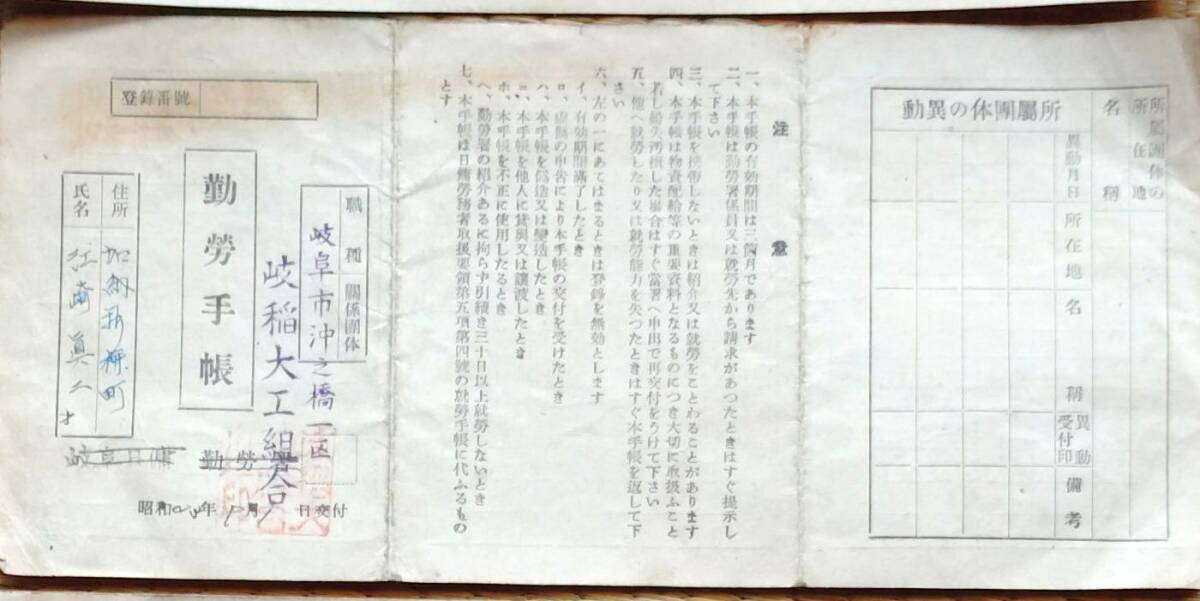 - f25010512〇大工組合勤労手帳 岐阜県 昭和23年〇和本古書