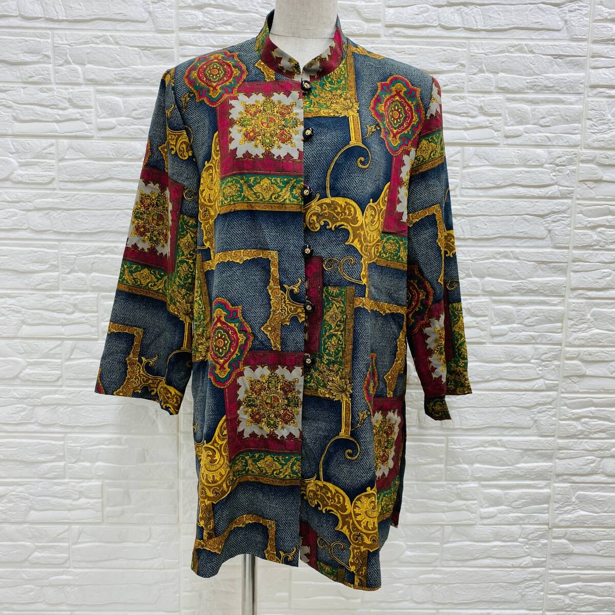- 【248】マルチパターン 総柄ジャケット 青紫 緑 ボルドー 四角柄ブラウス チャイナ ヴィンテージ サイズM