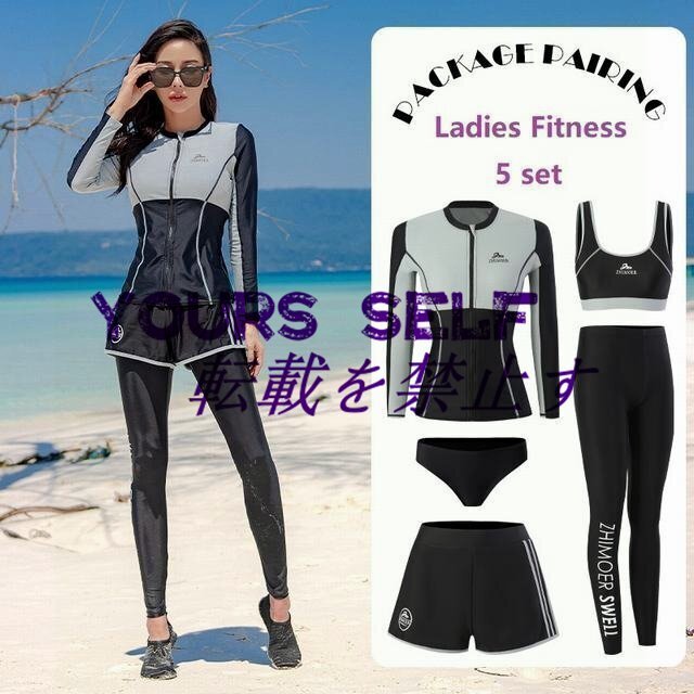 > 5点セット フィットネス サーフィン 長袖 水着 フィットネス水着 日焼け防止 競泳水着 ラッシュガード レギンス スイムウェア サイズL