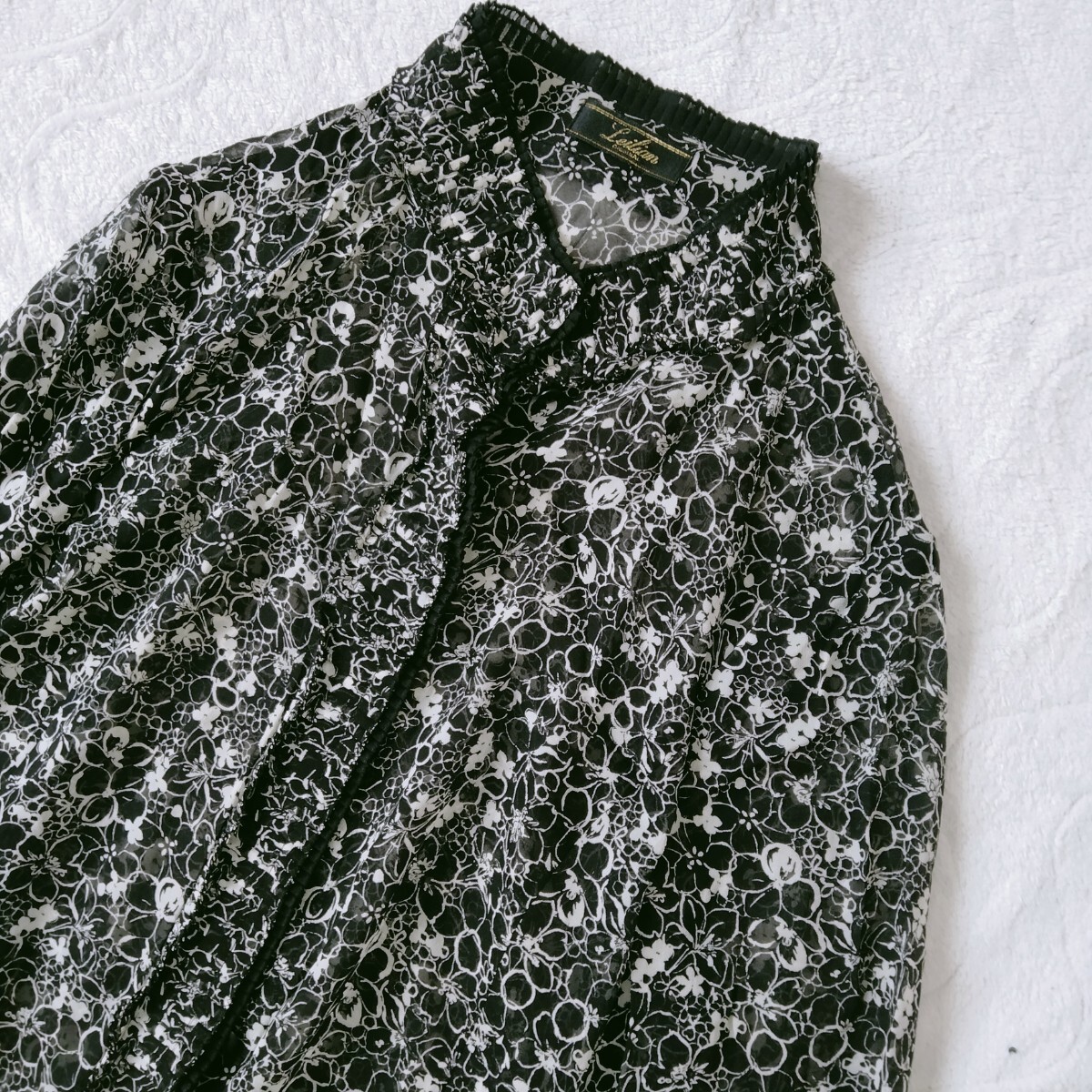 > Leilian*レリアン*シルク100%*大きいサイズ13+*花柄ブラウス*透け感*スタンドカラー*フリル*長袖シャツ*絹*春夏