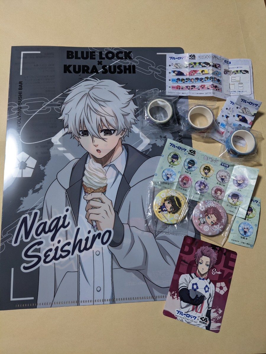 - くら寿司 ブルーロック缶バッジ 2種 マスキングテープ 3種 カード1種 クリアファイル 1種 凪誠士郎 蜂楽廻 糸師冴