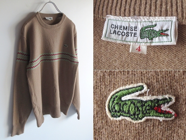 - 希少 80sビンテージ LACOSTE ラコステ ビームス別注元ネタロゴ 文字ワニ ウール ラインデザイン ニット セーター 4 キャメル 大沢商会
