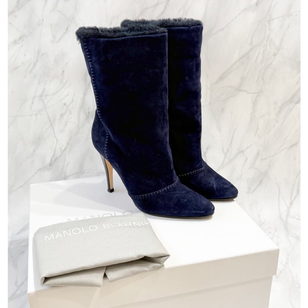 - マノロブラニク ムートンショートブーツ36ネイビー