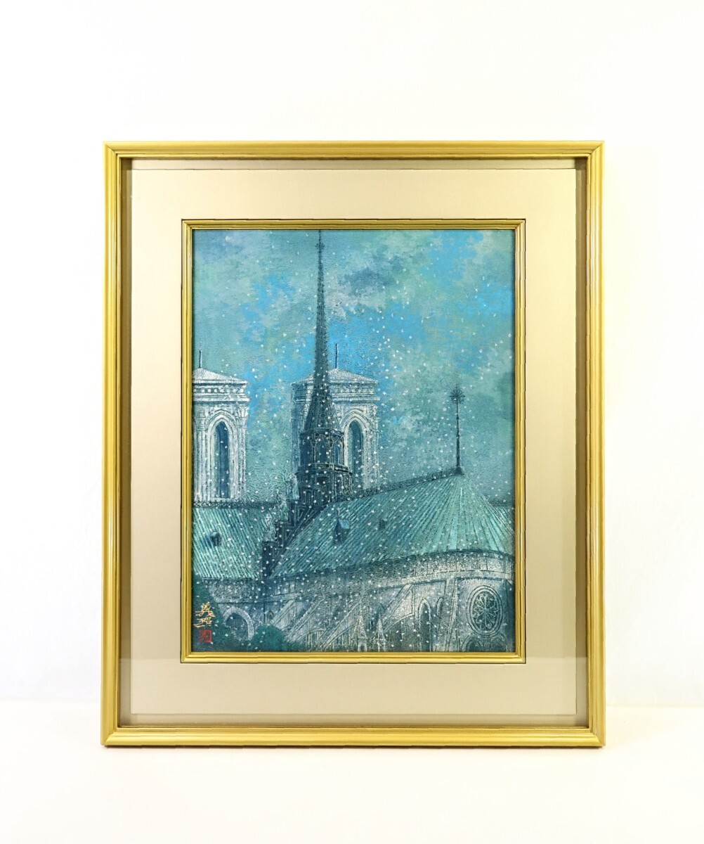 - 真作 野村義照 傑作日本画「ノートルダム」画寸 10号 大阪府出身 日本美術院院友 前田青邨 平山郁夫に師事 粉雪舞う大聖堂のパリ冬景 10238
