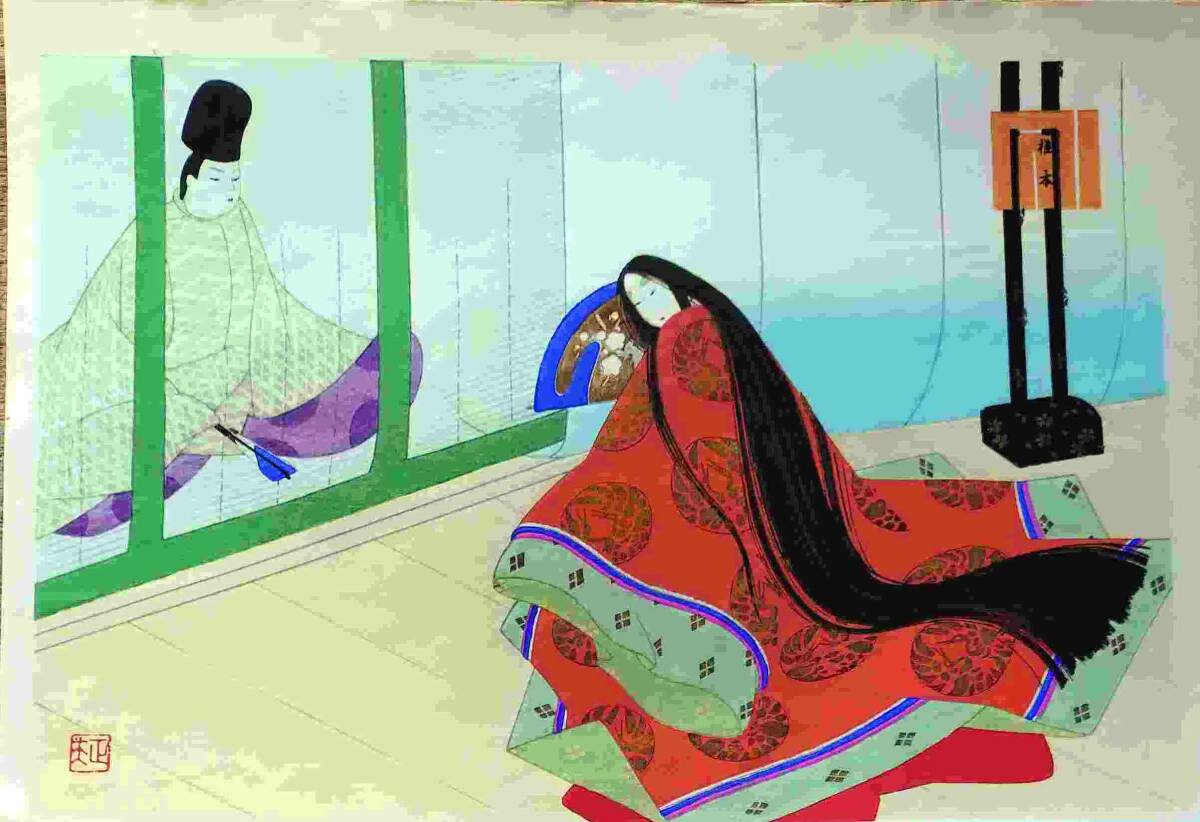 - f24121446〇彩色木版画1枚 源氏物語五十四帖 椎本 解説書付 海老名正夫原画 山田書院 昭和時代〇和本古書古文書
