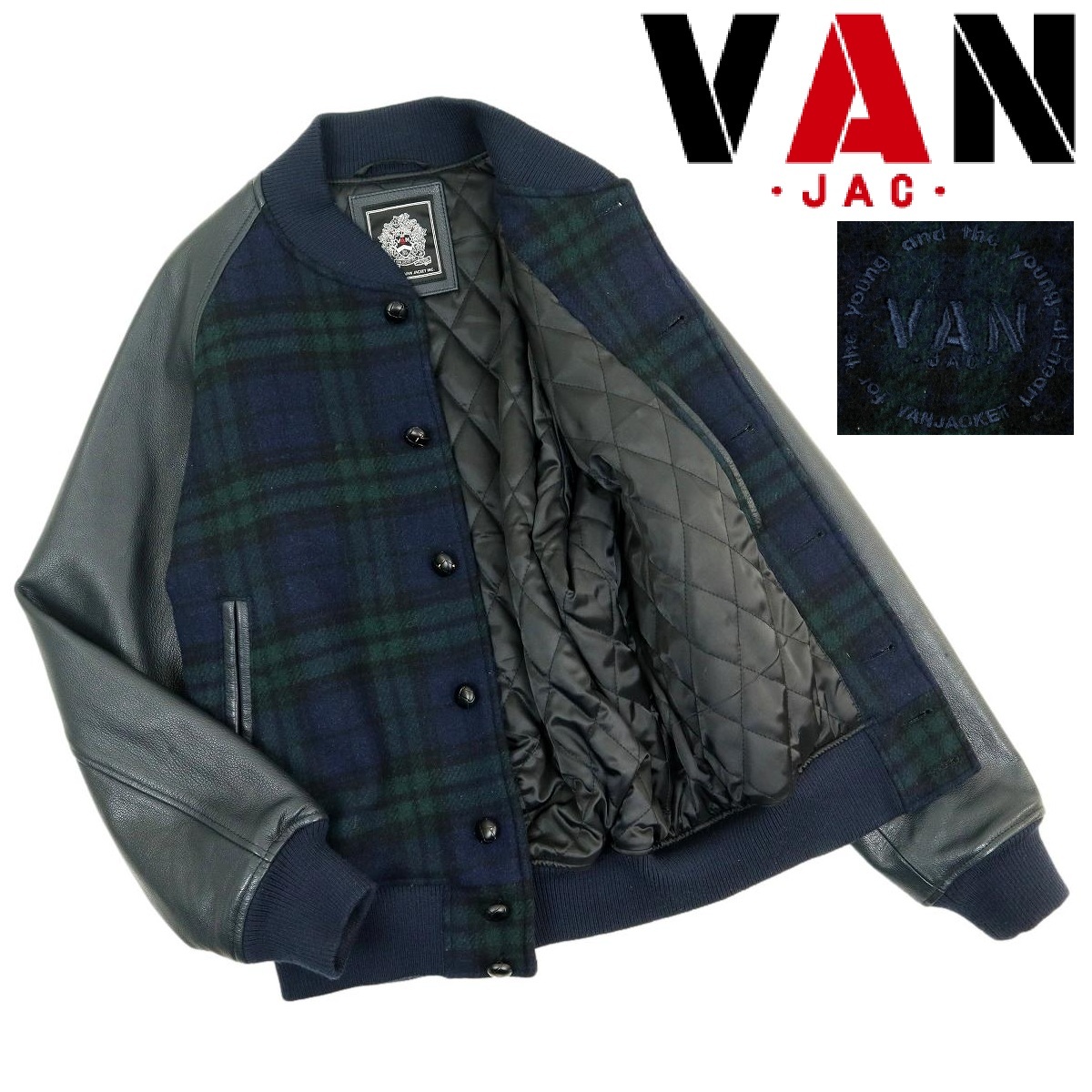 - 【T245】【美品】VAN JAC ヴァンヂャケット スタジャン レザージャケット ウール×レザー 胡桃ボタン チェック サイズL