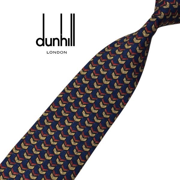 > ★美品★dunhill★高級ネクタイ ネイビー系 パターン柄 シルク ネコポス可 ダンヒル USED プレス済み t1206