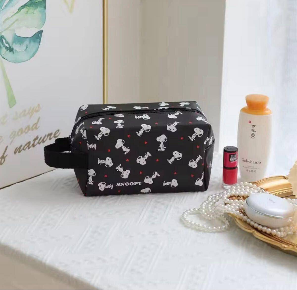- 【新品未使用】SNOOPY スヌーピー ポーチ ブラック 総柄 大容量 持ち手あり