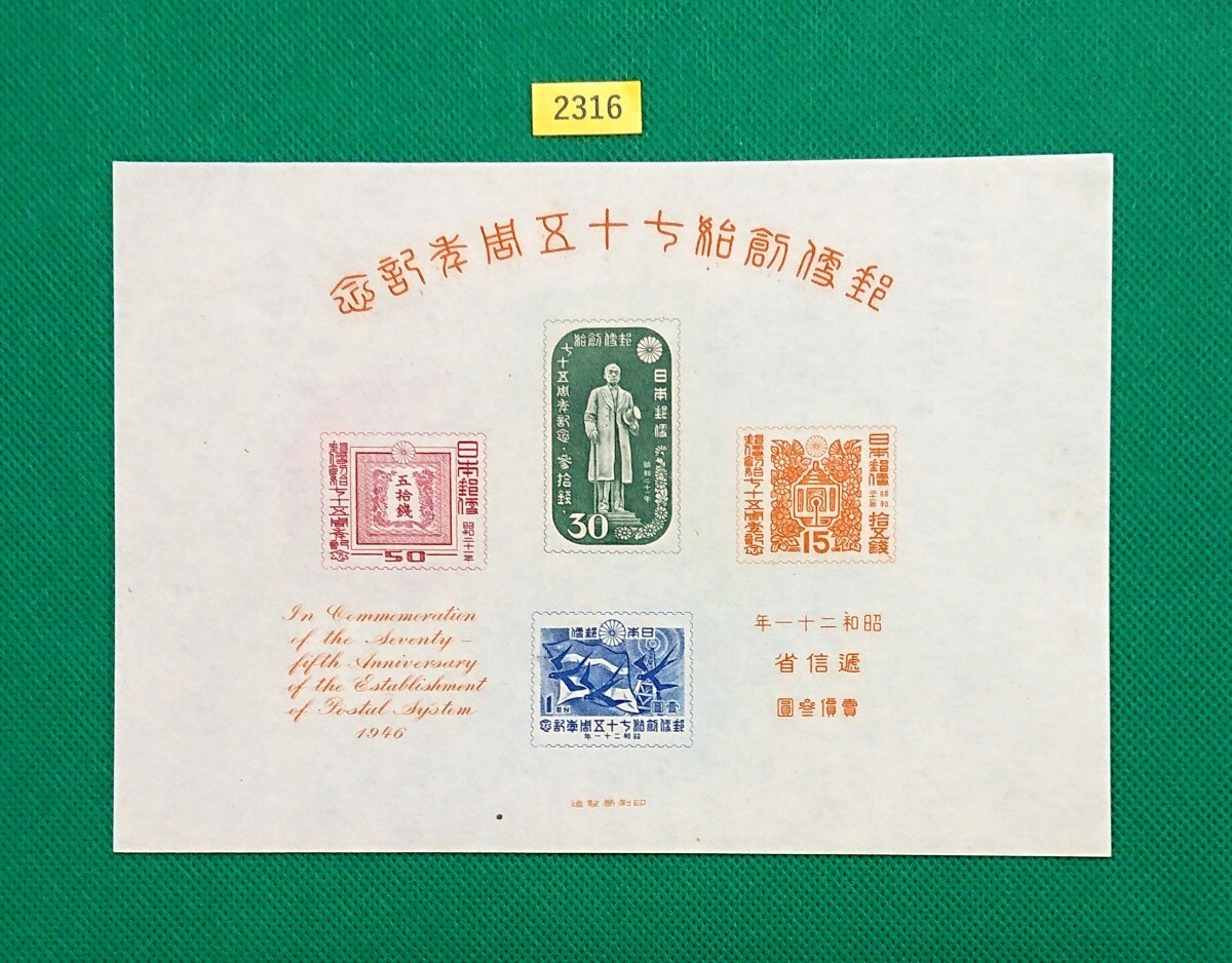 > 稀な高品質!郵便創始75年/小型シート/1946年/戦後初小型シート/NH/極上美品/シワ無/シミ無/カタログ価格28,000円/№2316