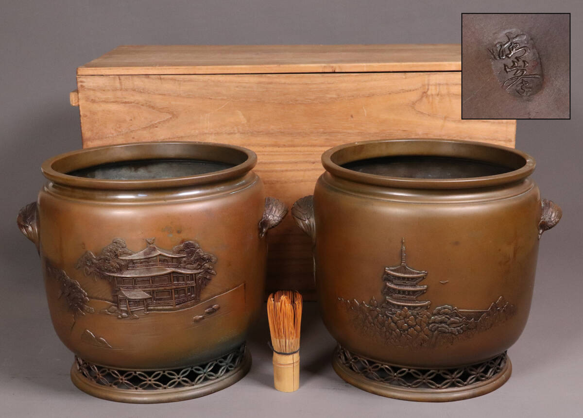 - 金工師 晴峯造 銅製 手あぶり火鉢一対 楼閣 七宝透かし 羽耳 手炉 木箱入り【MA377】