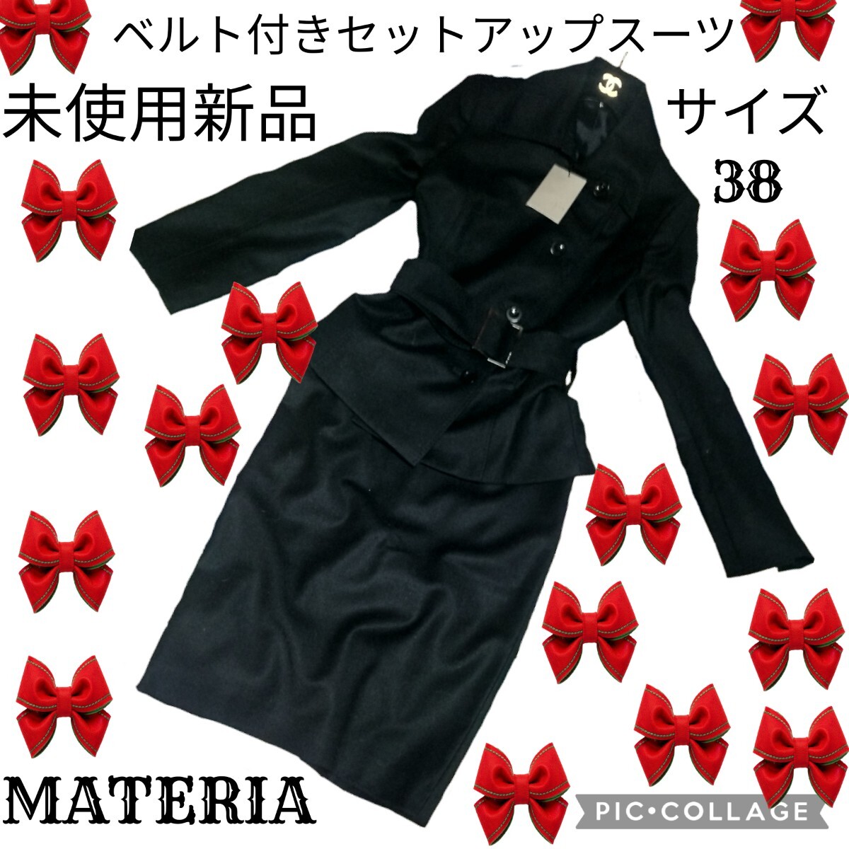 - 未使用★新品★MATERIA★マテリア★セットアップ★スーツ★タグ付き★ブラック★黒★春秋★膝丈スカート★スーツ★ベルト付き★ジャケット