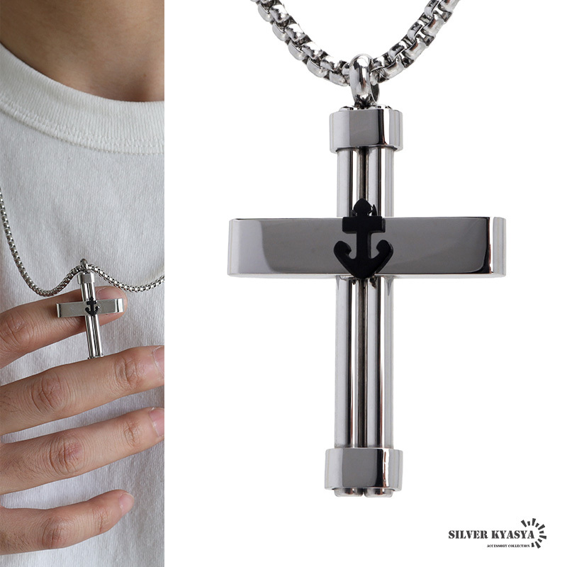 - ステンレス クロスネックレス 錨 シルバー ブラック ベネチアンチェーンネックレス 碇 イカリ 十字架 ボックスチェーン