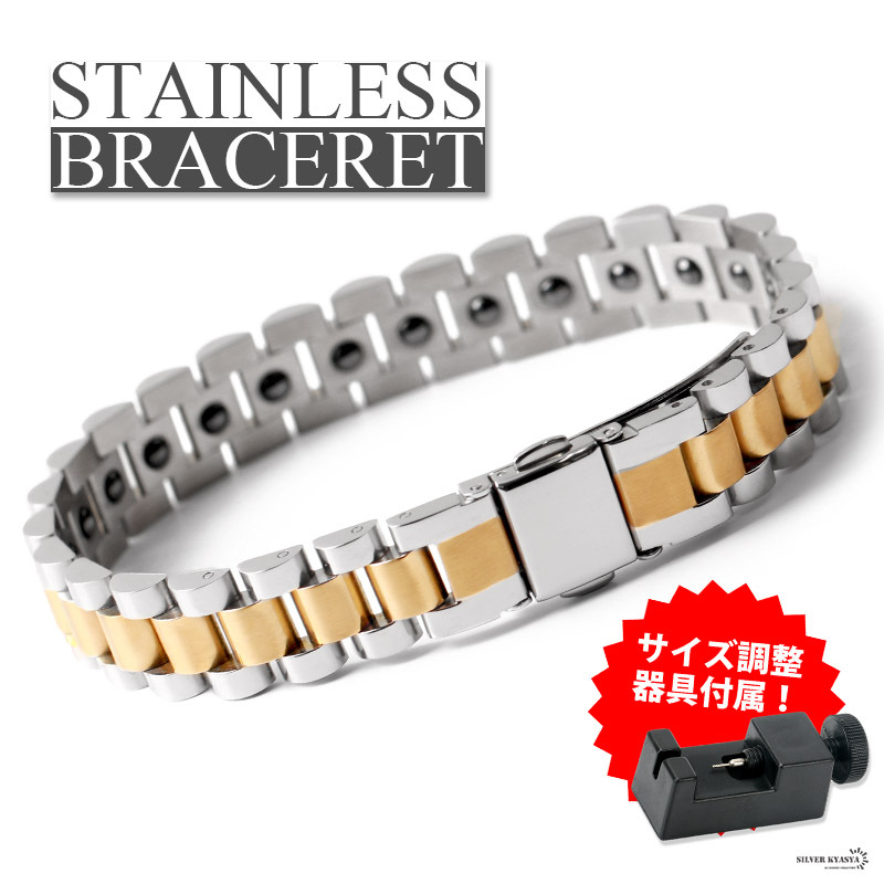 - 幅12mm メンズブレスレット ステンレス ゴールド シルバー メタルバンド 時計バンド ヘマタイト アレルギー対応 調整器具
