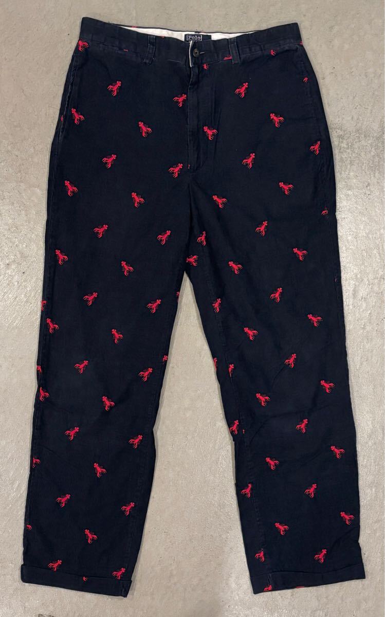 - 【USA製】90s POLO RALPH LAUREN ポロラルフローレン コットン コーデュロイパンツ 細畝 メンズ W32 紺/Navy ロブスター 刺繍 総柄 vintage