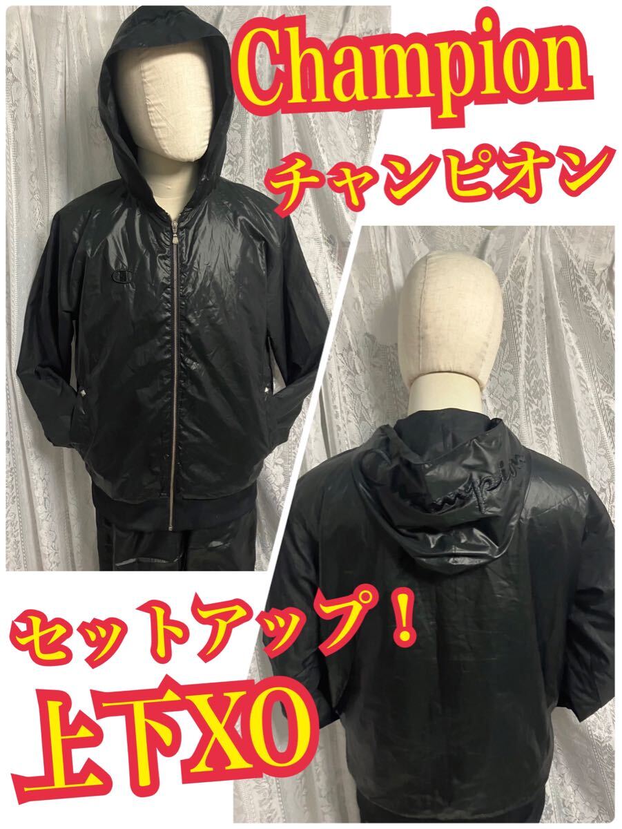 > Champion(チャンピオン)セットアップ ナイロンウエアランニング ブラック 刺繍ロゴ XO