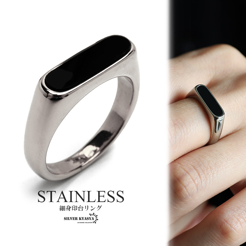 - (14号) 印台リング ブラック オニキスリング スクエア 細身 シグネットリング ステンレス シルバー 指輪 金属アレルギー対応