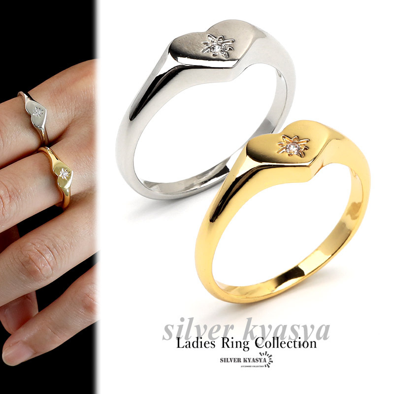 - (ゴールド、17号) ハートリング 印台 指輪 細身 2カラー ゴールド 18K GP K18 シルバー 小ぶり CZ