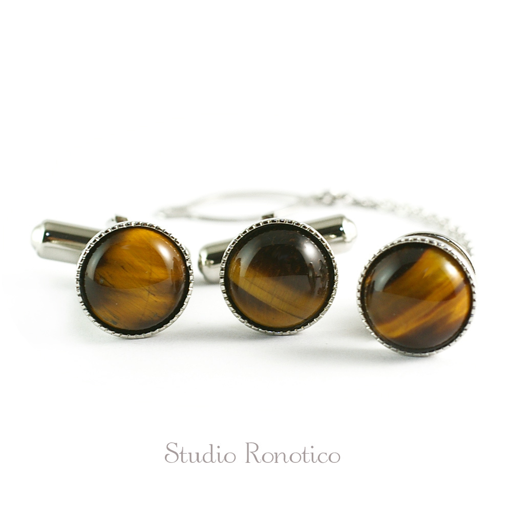 > [ロノティコ]Ronotico [ロノティコ]Ronotico タイガーアイ 虎目石 天然石 カフスボタン タイタック セット kf-22