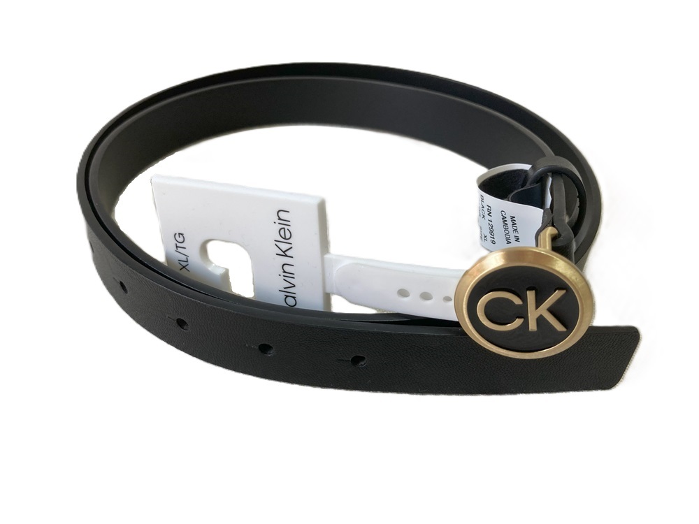 > 新品! カルバンクライン レディース CKバックル ベルト ブラック/ゴールドバックル L 黒金 Calvin Klein プレゼント 卒業式 入学式