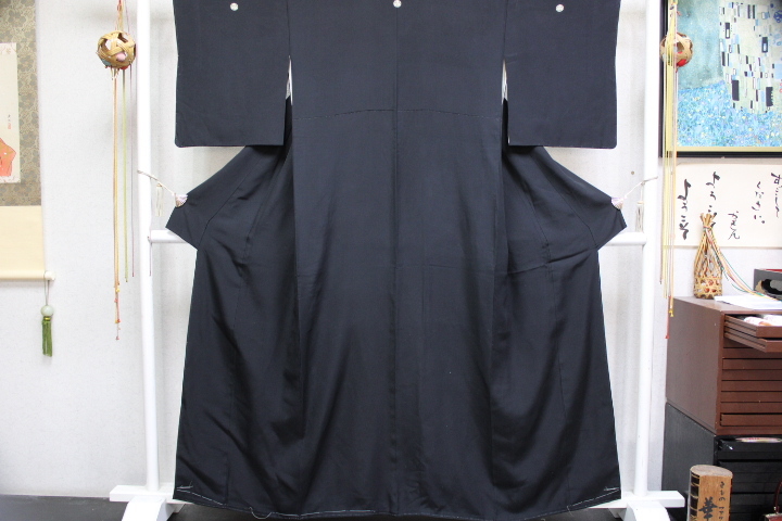> きもの今昔8178 黒の礼装 広衿袷手縫い喪服のきもの 正絹一越月光生地 家紋「丸に蔓柏」 身丈158cm
