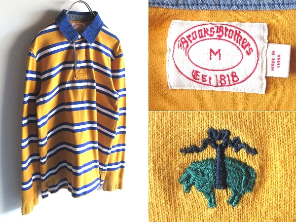 > 希少 00sビンテージ Brooks Brothers ブルックスブラザーズ ゴールデンフリース/羊ロゴ刺繍 ボーダー ラガーシャツ M イエロー ブルー