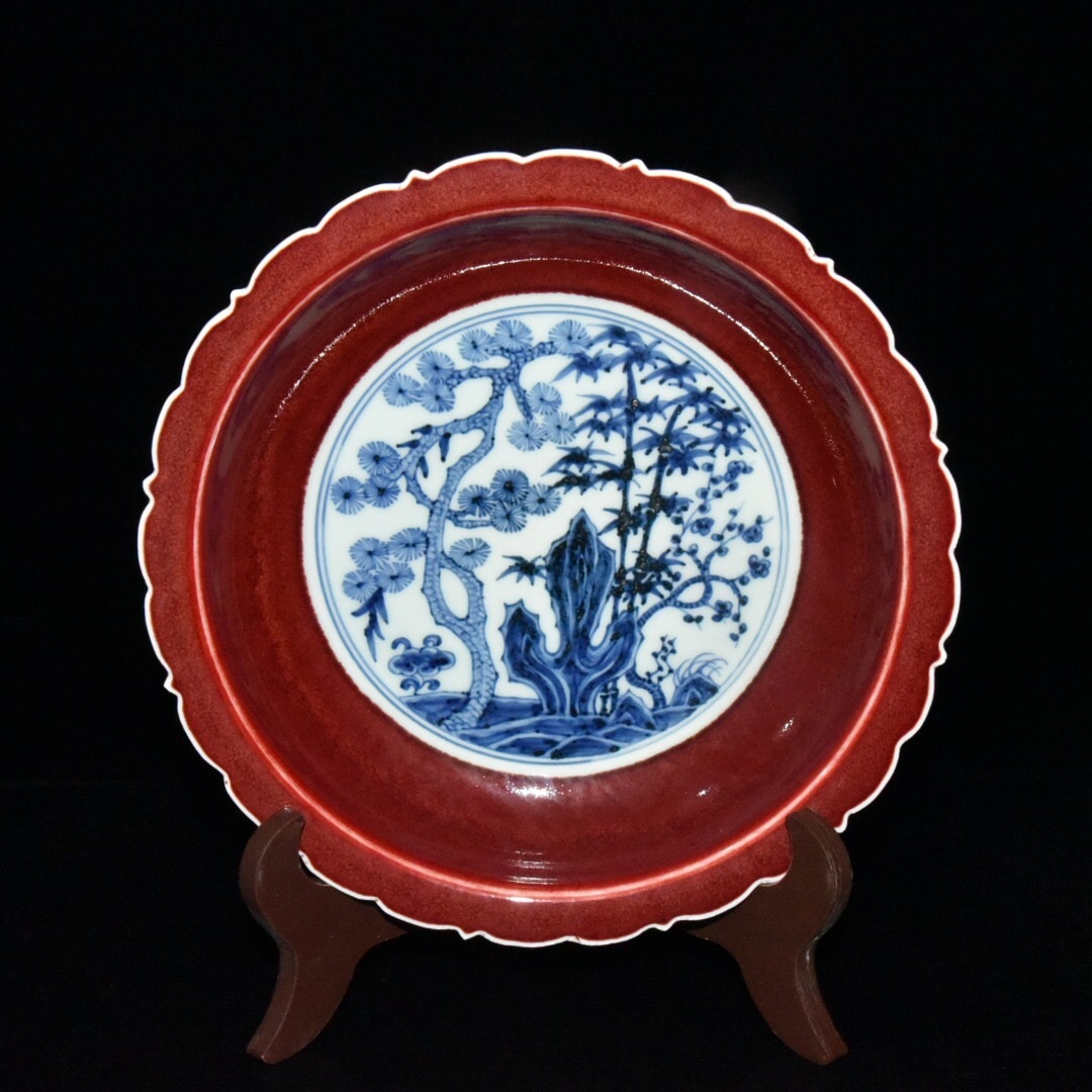 - 【超珍館蔵】明 永樂年製款 古陶瓷品 青花 霽紅 松竹梅紋 供盤 置物 古賞物 古美術品 稀少珍蔵品