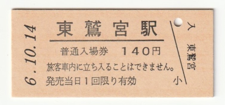 - 平成6年10月14日 東北本線 東鷲宮駅 140円硬券普通入場券(日付印刷)