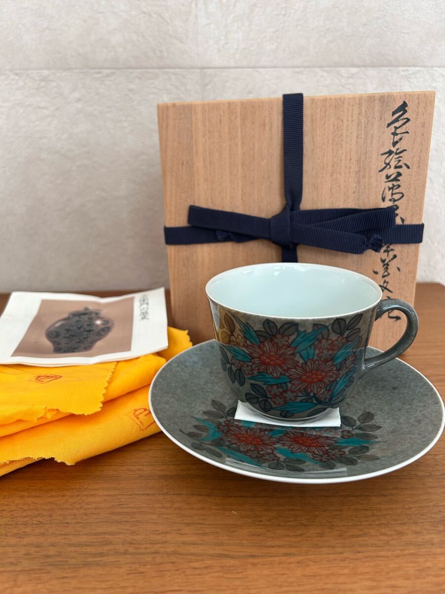 - 人間国宝 十三代 今泉今右衛門 本人作 色絵薄墨草花紋 珈琲碗 カップ&ソーサー カップ ソーサー 共箱 共布 栞 秀作 送料無料 検 柿右衛門