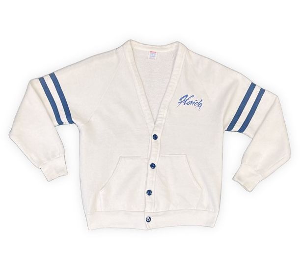 - 80's 米国製 JERZEES BY RUSSELL ジャージーズ ビンテージ スウェット カーディガン Florida フロリダ 白青 M [la-1188]