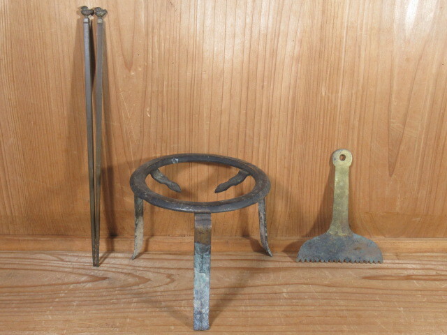 - ◆時代囲炉裏道具3点:7:◆3点銅製:真鍮造◆三足真鍮製五徳◆真鍮:持ち手頭鳥:火箸◆真鍮:灰掻◆鍛冶屋頑丈造◆