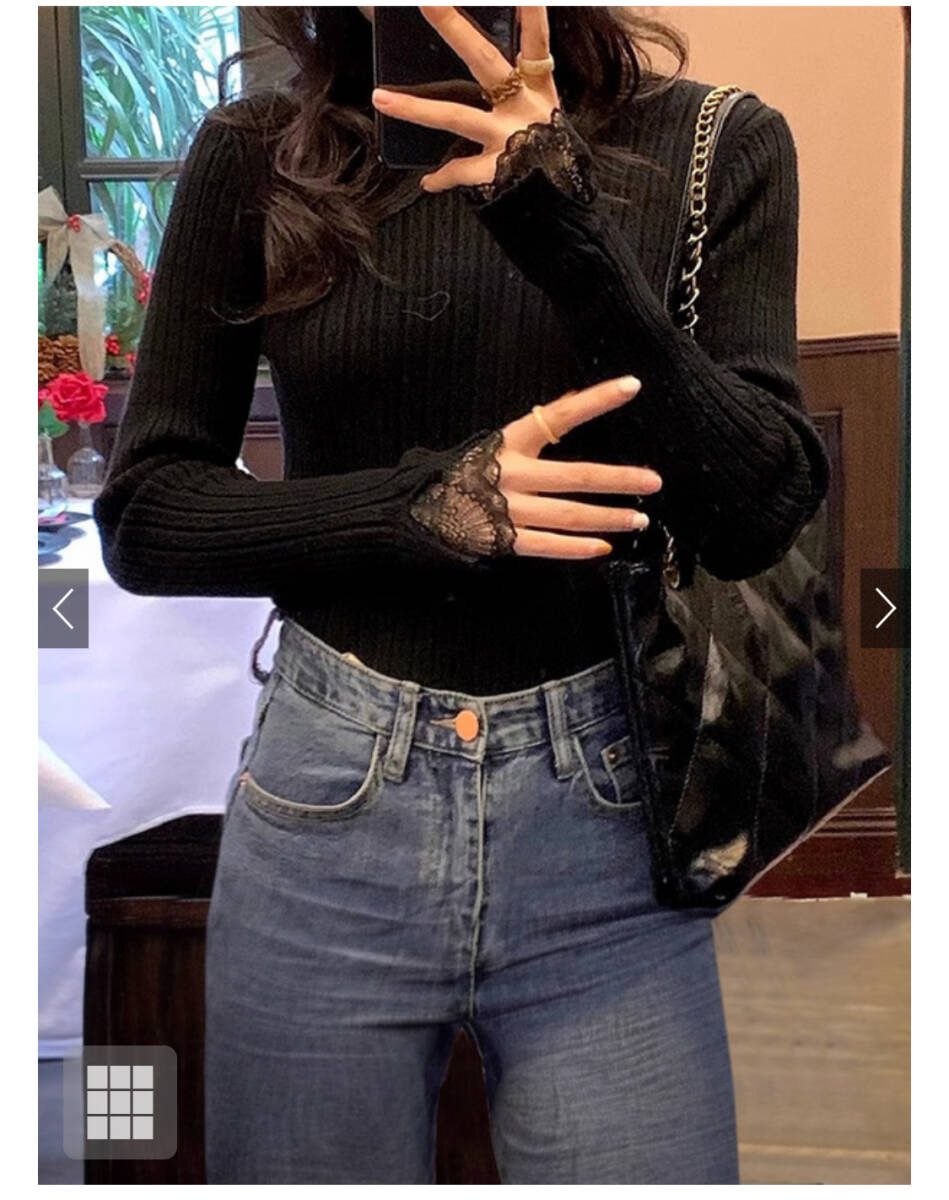 - 長袖 ニットソー ハイネック セーター レース袖 リブニット サイズF ブラックGLR
