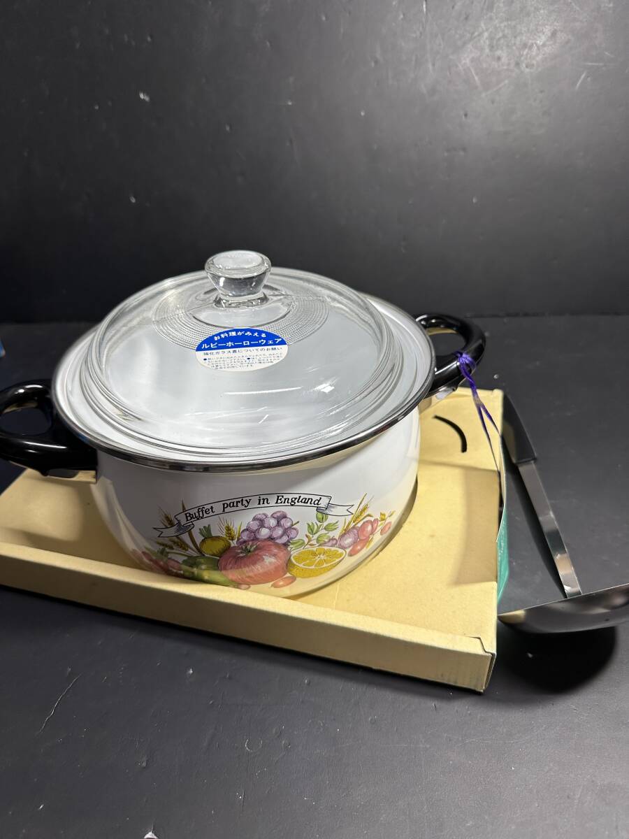 - ★コレクター必見!! 未使用 ビンテージ 当時物 フルーツ絵柄 ホーロー鍋/おたま 調理セット 両手鍋 ガラス蓋 調理器具 箱付き V729