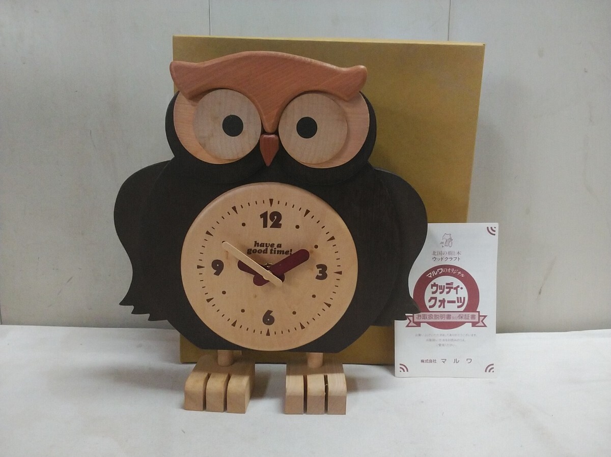 - マルワ ウッディクオーツ【 フクロウ置時計 23×7×高25.5cm 】長期保管在庫品 動作OK インテリア