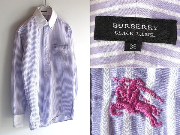 - 希少 BURBERRY BLACK LABEL バーバリーブラックレーベル ホースロゴ刺繍 クレリック ストライプシャツ BDシャツ 38 ラベンダー ホワイト