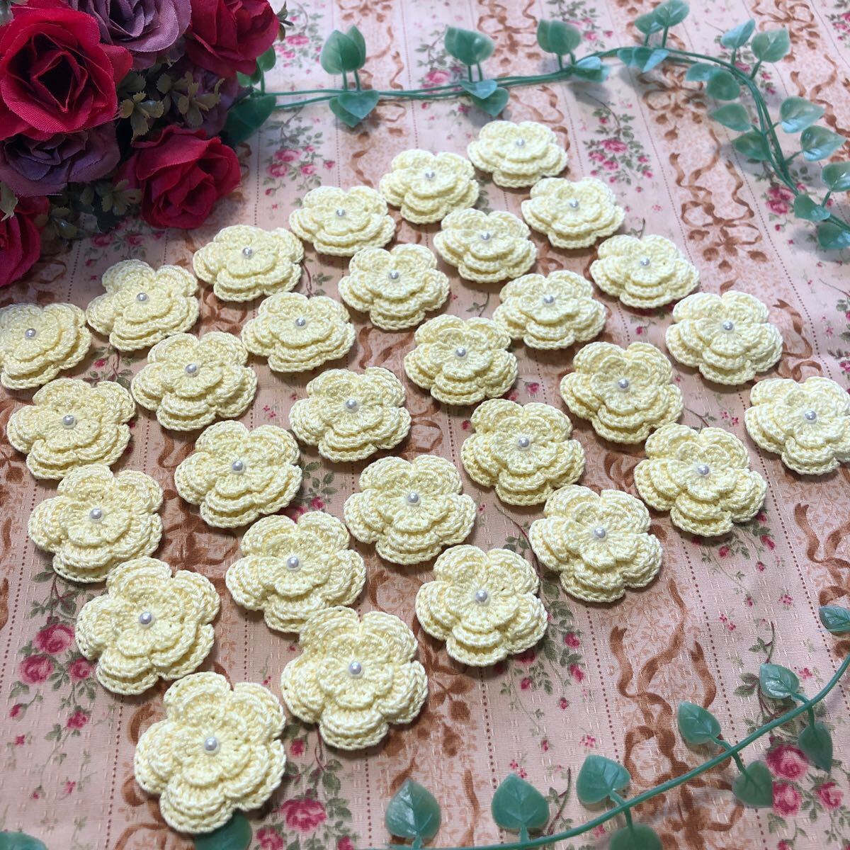 - (No.219)☆ハンドメイド☆3重お花(^^)30枚【ベビーイエロー】モチーフ パーツ等に 編み重ねタイプ