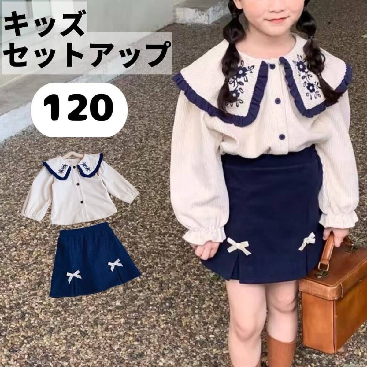 - 【120cm】キッズ 大きめフリル襟 上下セット トップス スカート風ズボン 入園式 入学式 お呼ばれ