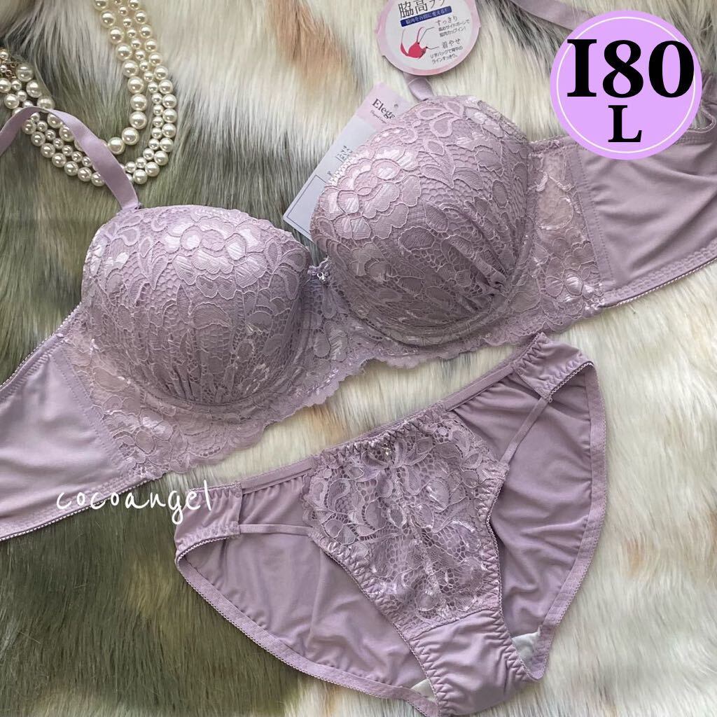 - 【I80/L 薄紫 上下セット】新品 ブラ&ショーツセット ブラジャー ショーツ パッド内蔵 脇高 レース グラマー Iカップ 大きいサイズ