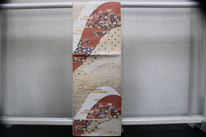 > きもの今昔8275 袋帯 西陣織正絹24金箔900錦袋帯 アイボリ地山なりに伝統小文様彩色小花模様 美品