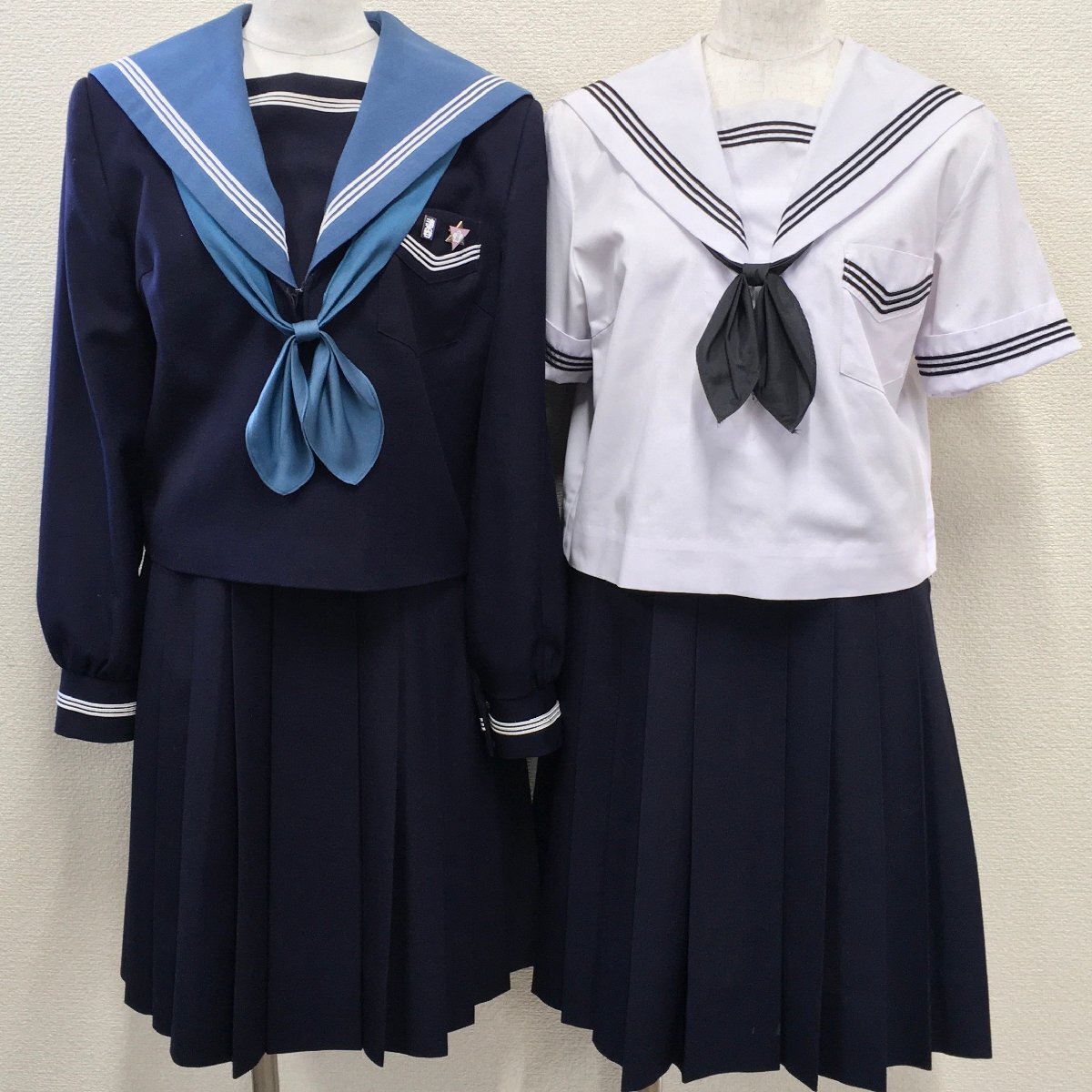 > A1361/S1412(中古)大阪府 清水谷高校 6点 /校章付き/セーラー:160A/スカート:W63/青襟カバー/リボン/関西襟/制服/学生服/卒業生品