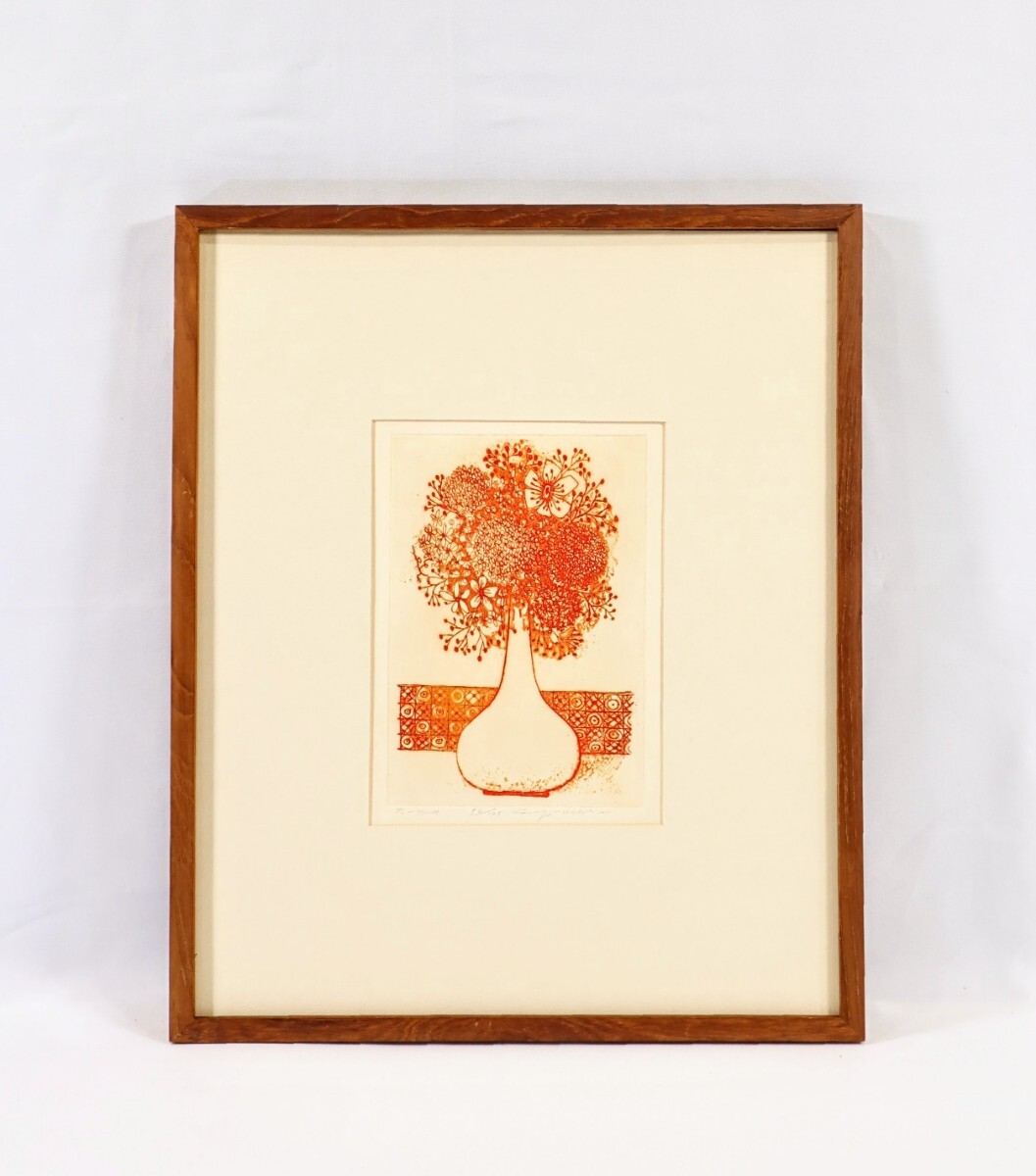 - 真作 牛玖健治 1977年銅版画「花-77-M」画13.5×20cm 千葉県出身 日本版画協会会員 生命力溢れる素朴でポエティカルで静かで深いもの 10443