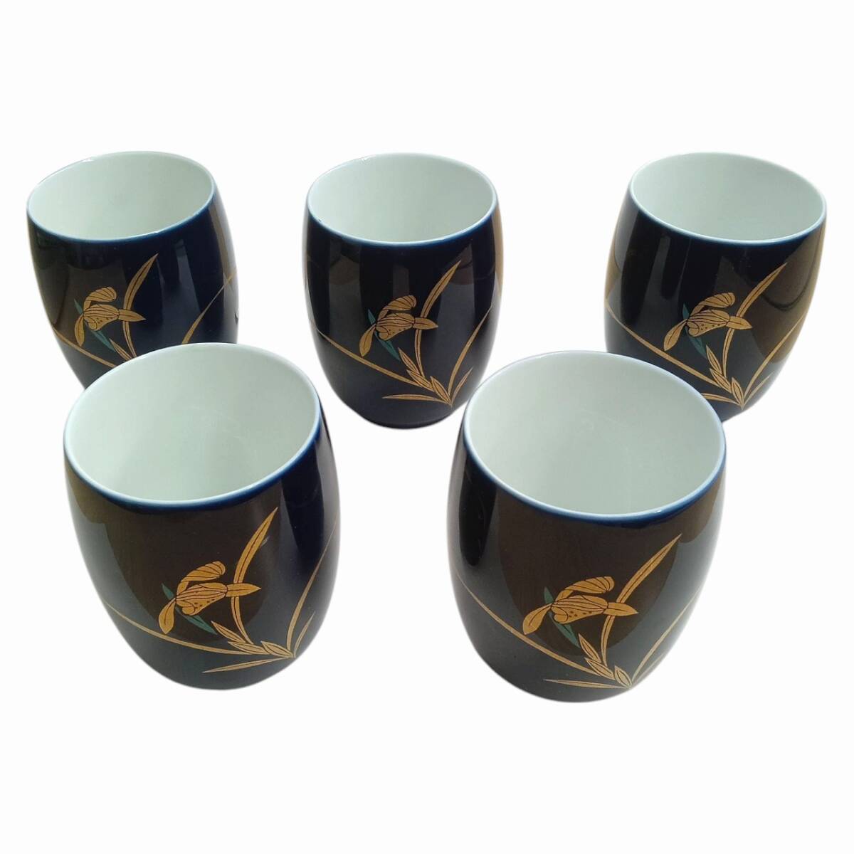 - 香蘭社 瑠璃金彩 湯呑み 花柄 藍色 紺 ネイビー 陶器 茶器 5客揃 セット【中古】