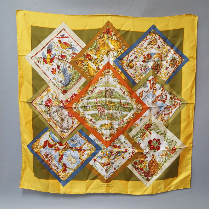 > 美品 Salvatore Ferraamo フェラガモ スカーフ ブラウン系 大判 シルク 100% マルチ タイガー ヒョウ 象 キリン カレ ケース付 イタリア製