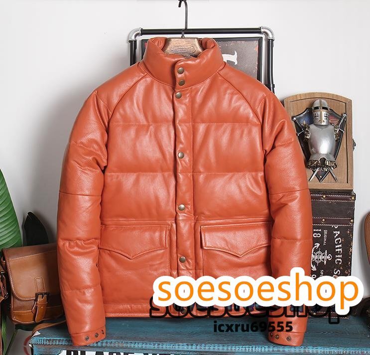 - 秋冬新品★ レザーダウンジャケットトップレイヤー牛革ウォームレザージャケットメンズスタンドアップカラースリムレザージャケット