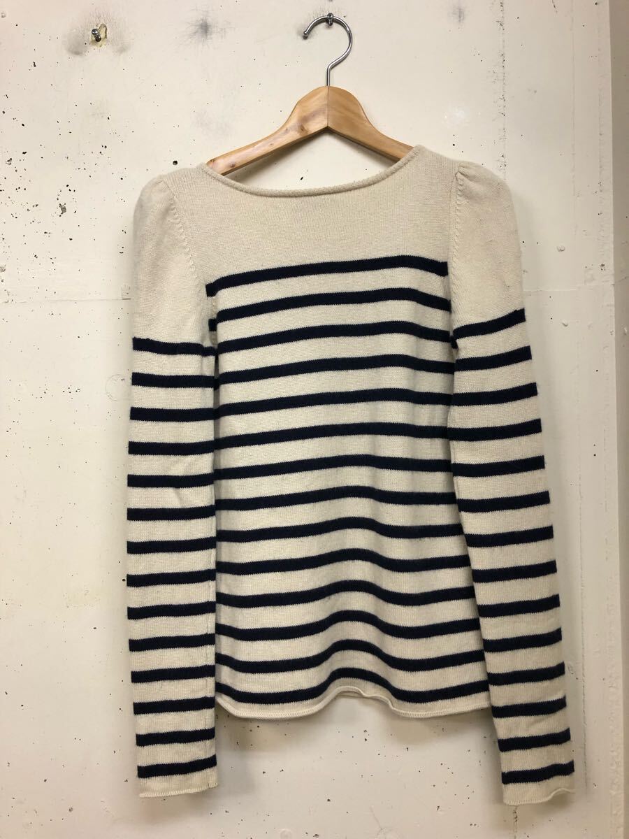 - Drawer ドゥロワー カシミア ボーダー ニット セーター 1 パフスリーブ 紺 ナチュラル