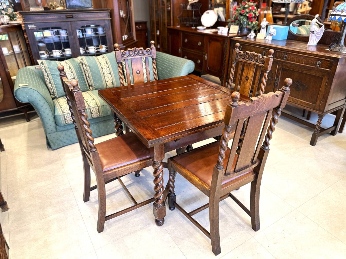 - 【値下】5C06 イギリスアンティーク ツイストレッグドローリーフテーブルセット伸長式4人掛けダイニング