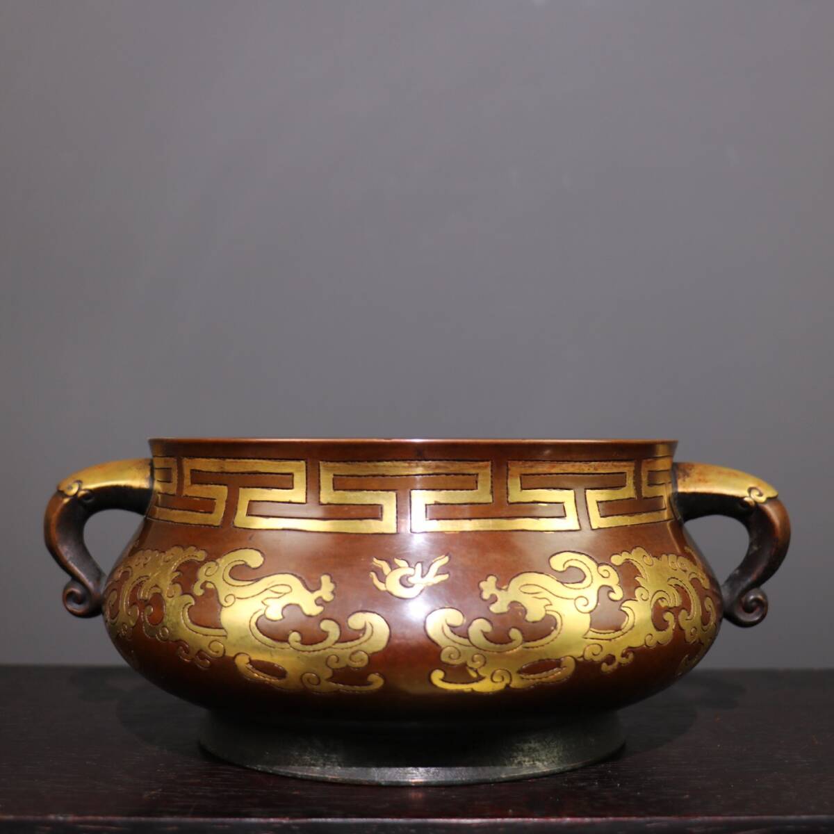 - 【超珍館蔵】紫銅製 塗金 雙耳 雙龍戲珠紋 熏香炉 置物 古賞物 古美術品 稀少珍蔵品