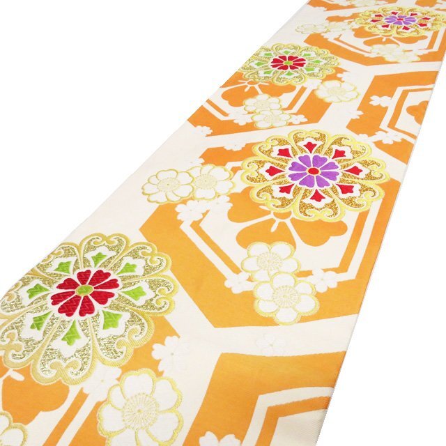 - 袋帯 振袖用 中古 リサイクル 正絹 フォーマル 仕立て上がり 六通 華文 花模様 桜 梅 箔糸 練色 橙色 多色 金 きもの北條 A1157-12